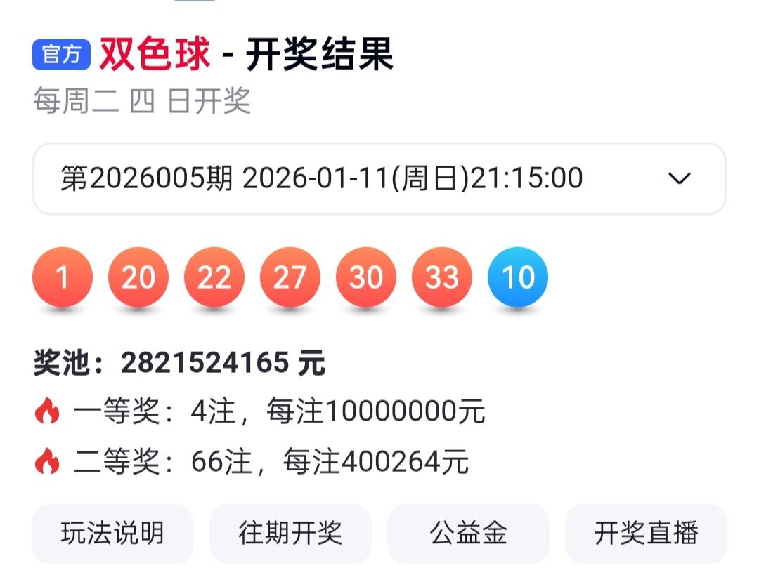 彩票,彩票平台,彩票网站,彩票APP下载,六合彩,快三双色球奖池再创新高,冲破28.2亿元大关!新年第五期,又送出4注1000万元封顶大奖,2026年开年仅11天已诞生7注千万巨奖。2026年1月11日晚,双色球第2026005期开奖。本期全国销售额达3.88亿元。按从小到大顺序,本期开奖号码为:红球 01、20、22、27、30、33,蓝球 10。