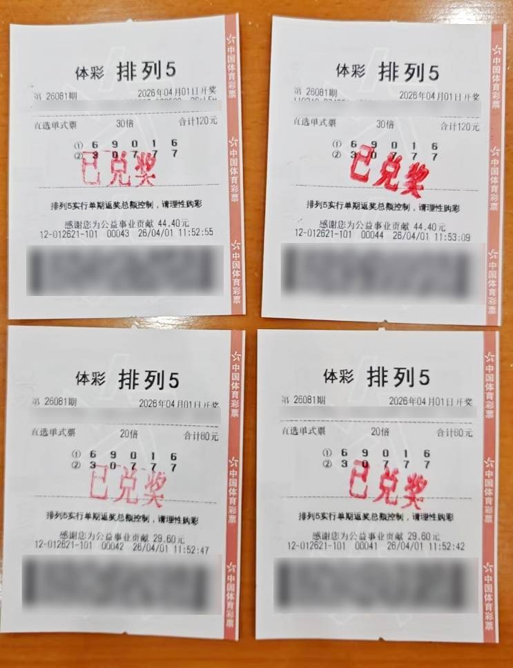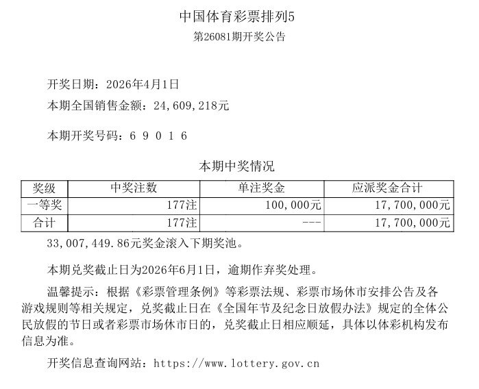 彩票,彩票平台,彩票网站,彩票APP下载,六合彩,快三4月1日,中国体育彩票排列5第26081期开奖。开奖号码:6 9 0 1 6。全国共中出177注一等奖,单注奖金固定为10万元。
