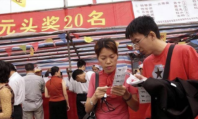 线年代昙花一现的即开型彩票。两块钱摸一张,现场刮开兑奖,彩电、汽车、冰箱,丰厚大奖就在旁边摆放,现场气氛极为高涨。
