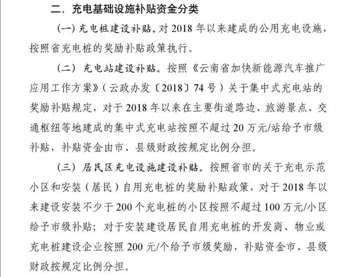补贴标准:对向电网经营企业直接报装接电的经营性集中式充换电设施用电,执行大工业用电价格,2020年前暂免收基本电费;其他充电基础设施按照其所在场所执行分类目录电价。其中昆明的补贴标准分类如下图所示: